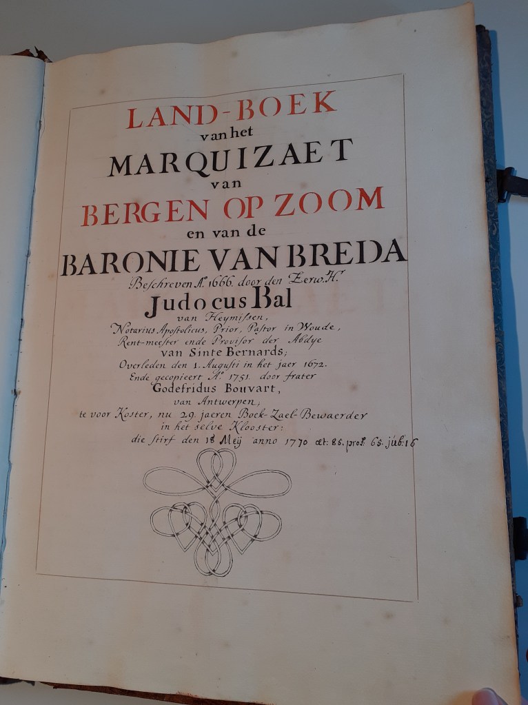 (AAB) = Archief Abdij van Bornem, inv. 342 Kopie door Godefridus Bouvaert van het landboek van de abdij Sint-Bernards aan de Schelde door provisor Judocus Bal betreffende de Goederen gelegen in het markiezaat Bergen-op-Zoom en de baronie Breda. “Land-boeck van het marquizaet van Bergen op Zoom en van de Baronie van Breda.”