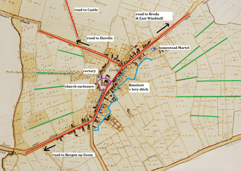 Hier is de ruwe vorm van het middeleeuwse dorp Wouw met de oude wegen, lintbebouwing en ommuurde kerkhoeve. De onderliggende kaart is een 18e-eeuws schotboekkaartje . De woning van de heer van Breda is het kadertje (rectory) ten noordwesten van de ommuring van de kerk, de tuin lag ernaast.