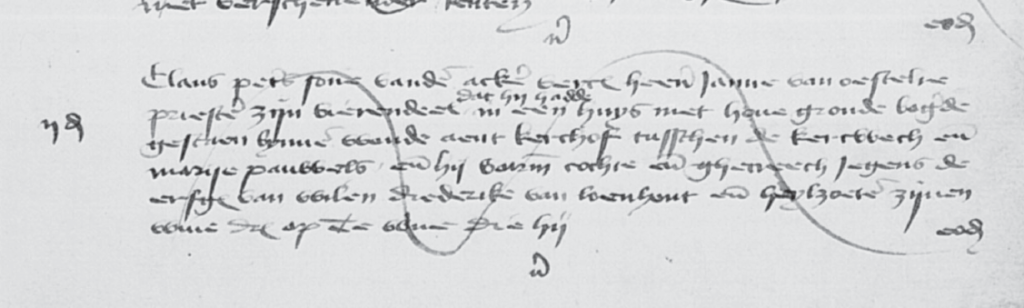 “…abbati et conventui monasterii Loci sancti Bernardi Cysterciensis ordinis, Cameracensis dyocesis, domum sive mansionem suam, sitam in Woude iuxta planitiem, vulgariter Laer nuncupatam, non longe ab ecclesia, cum suo fundo, domistadio videlicet et orto et omnibus edificiis, iam edificatis vel in posterum edificandis, et omnibus appenditiis seu attinentiis eiusdem…”