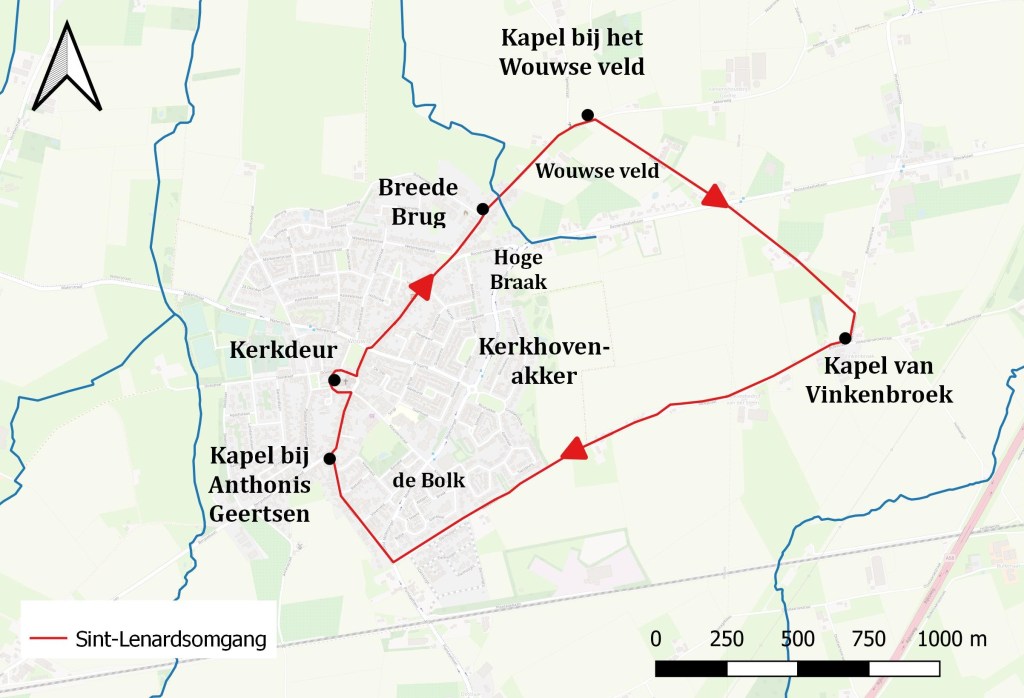 Alhoewel ook in andere bronnen naar de Wouwse Sint-Lenardsomgang verwezen wordt, biedt deze aantekening ons toch waardevolle nieuwe gegevens.[11] Zo leren we dat de Sint-Lenardsomgang met de klok mee rond de oude Kerkhoven-akker (de latere Omgangsakker) leidde en de eerste stop de brede brug over het Holriet was. Vermoedelijk werd hier halt gehouden vanwege de Kruisstraat (de hedendaagse Donkenweg) die vlakbij deze brug op de Spellestraat uitliep en waar mogelijk toen al een stenen kruis stond.[12] De volgende stop was de kapel bij het Wouwse veld die volgens de parochiekroniek van Hoffman uit 1770 vlak voor de splitsing van de Spellestraat met de Boterstraat stond.