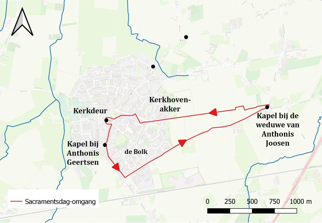 Vervolgens kwam de processie bij de kapel van Vinkenbroek die volgens een kaart uit 1769 op de splitsing van de Boeiinksestraat met de Vinkenbroeksestraat was gelegen.[13] Vanaf Vinkenbroek ging de processie weer richting Wouw, waarna de volgende stop wordt aangeduid als de kapel bij Anthonis Geertsen.[14] Vermoedelijk gaat het hier om de kapel op de kruising van de Bergsestraat met de Plantagebaan die eveneens in de parochiekroniek van 1770 wordt vermeld.[15] Ten slotte eindigde de processie bij de kerkdeur van de Sint-Lambertuskerk.