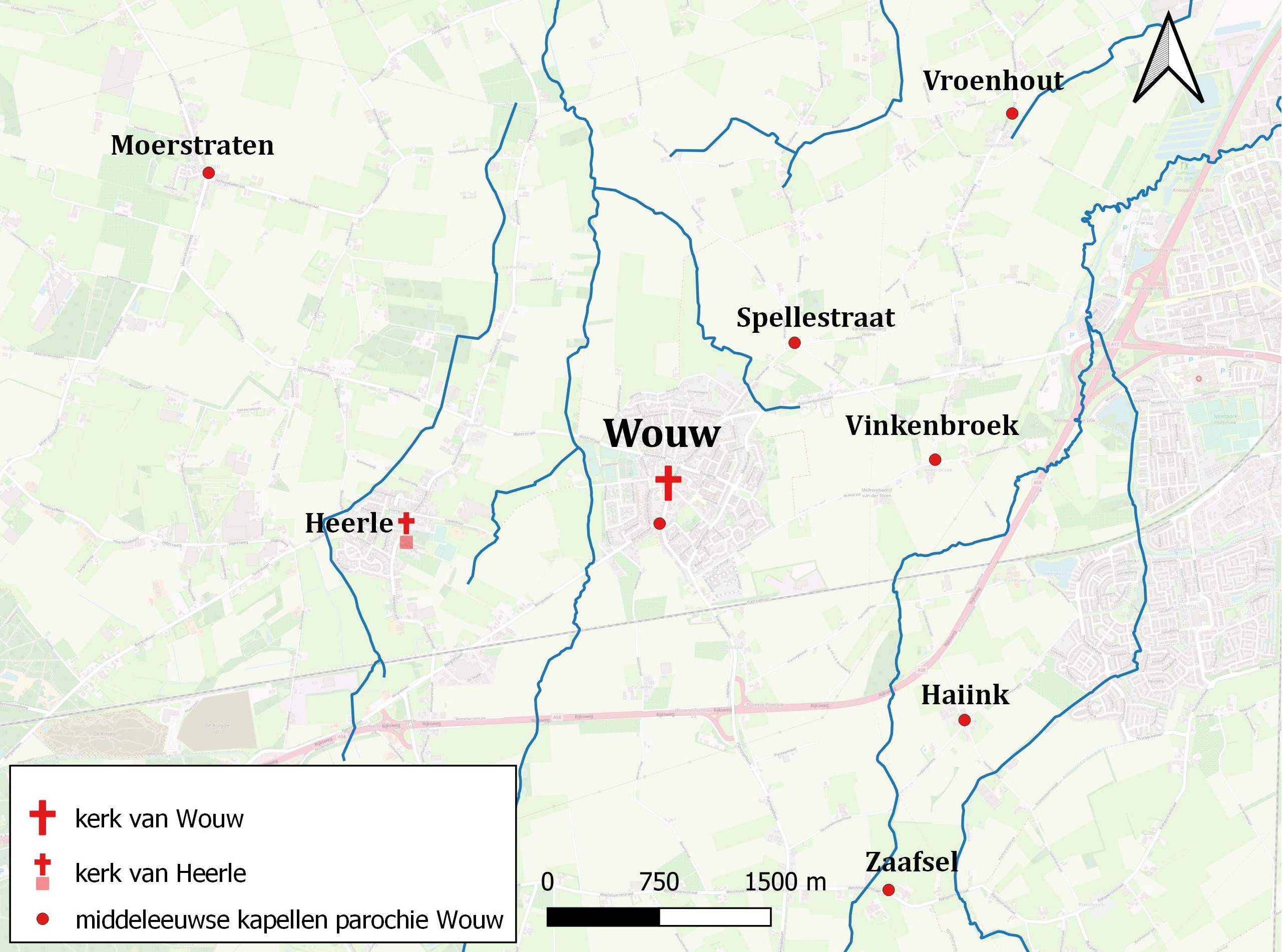 Daar kunnen we de kapel van Vroenhout en de kapel van Moerstraten aan toevoegen aangezien deze gebouwtjes op vroeg-zestiende-eeuwse kaarten staan afgebeeld.[21] Ook de kapel van Zaafsel moet ten tijde van het protocol van 1507-1511 al hebben bestaan. We komen het gebouwtje tegen in een Antwerpse schepenaantekening uit 1463 en is daarmee de enige kapel in de parochie Wouw waarvoor we over vijftiende-eeuws gegevens beschikken.[22] Volgens de parochiekroniek van Hoffman stonden er ook veldkapellen bij Westelaar en Wouwse Hil maar of die in deze periode ook al gebouwd waren, is tot dusver ongewis. Ondenkbaar is het echter zeker niet.[23]
