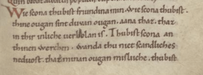 Ik wees Sanne er op dat deze teksten wetenschappelijk gezien niet helemaal Oudnederlands waren omdat beide teksten kopieën zijn van Duitse voorbeelden. De Nederlandse monniken hebben indertijd de taal van deze voorbeelden aangepast naar hun eigen “Nederlandse” dialect maar op flink veel plekken schemert de Duitse oertekst nog in het handschrift door. Daar komt bij dat de Wachtendonckse Psalmen en de Leidse Williram taalkundig flink van elkaar verschillen en de teksten daarom allebei op een andere manier “Duitse” taalsporen bevatten.