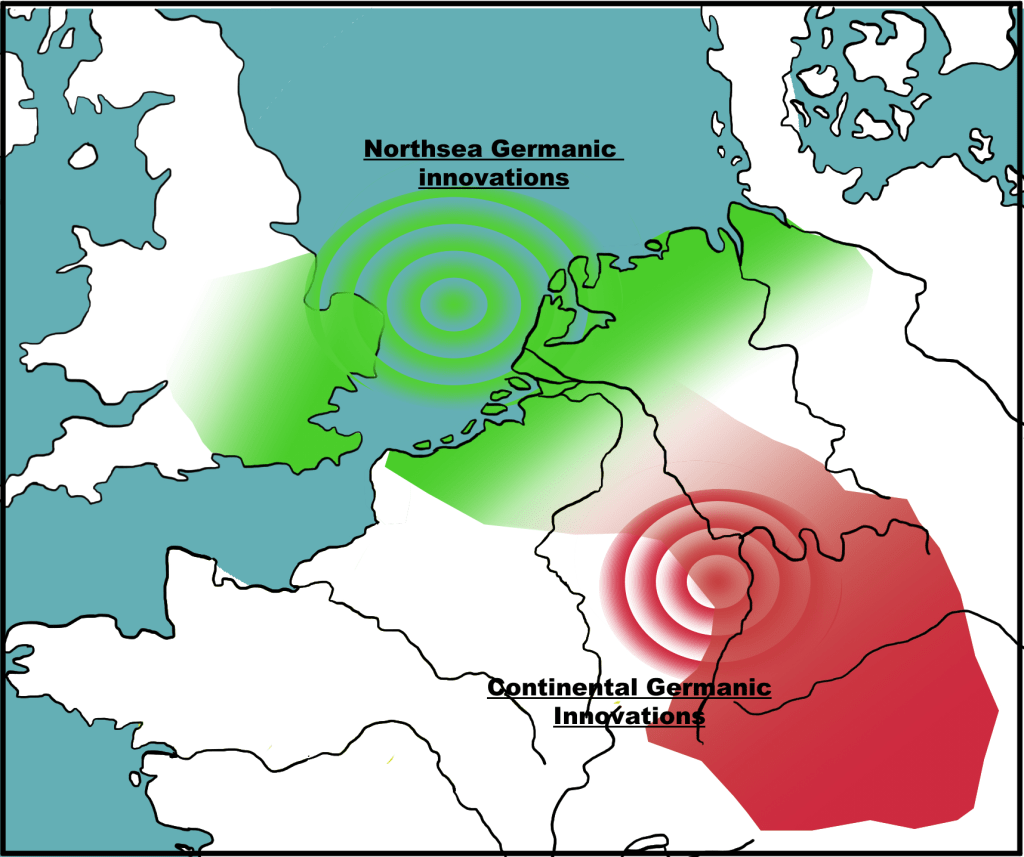 Het Oudfrankisch dat in Nederland en België gesproken werd, onderging golven van taalkundige innovatie uit twee richtingen. De innovatiegolven uit Engeland rekenen we tot de Noordzeegermaanse kenmerken. Dit is de reden waarom het Engelse five en het Nederlandse vijf zo veel op elkaar lijken. De innovatiegolven uit Duitsland zijn verantwoordelijk voor de Continentaal-Germaanse kenmerken.