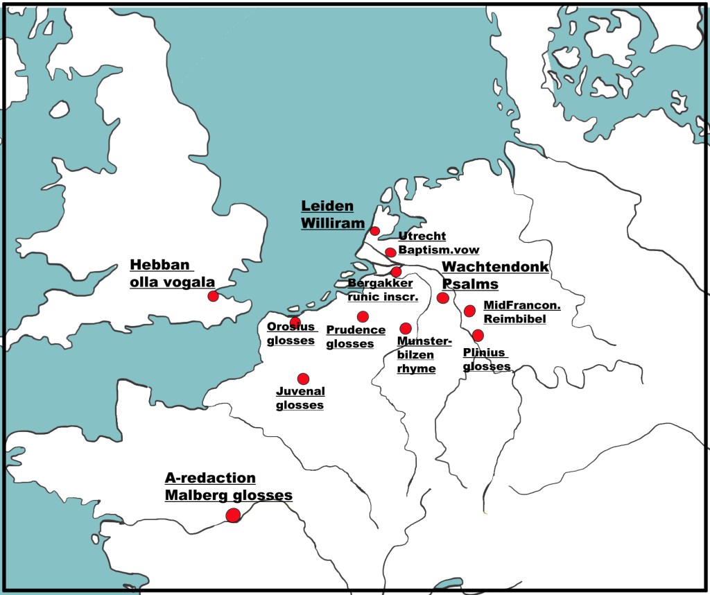 Aan de Nederlandse en Vlaamse kust werd dus nog geen Nederlands gesproken. Daar sprak men nog lange tijd een vroege variant van het Fries. Het Nederlandse taalgebied liep in deze periode wel een stuk verder door naar het zuiden dan dat van het huidige Nederlands. In Noord-Frankrijk en Wallonië werd namelijk toen ook nog Oudnederlands gesproken, vaak naast de lokale Franse dialecten.
