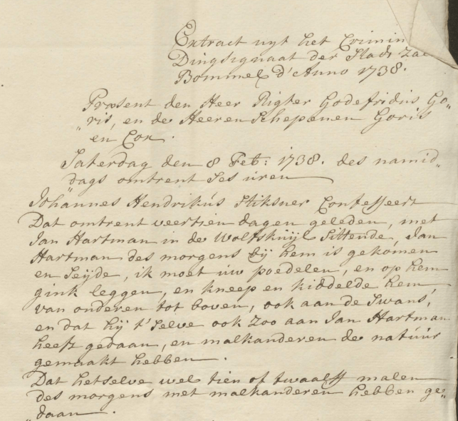De bekentenissen in het strafdossier zijn verrassend openhartig in taalgebruik en details. Johannes benoemde de seksuele handelingen als poedelen (bepotelen) en kiddelen (kietelen). Ook vertelde Johannes dat hij al op zijn negentiende ervaring had opgedaan met een Brandenburgse soldaat. Jan Hartman bekende eveneens een voorgaande ‘ontmoeting’: in het verleden zou hij een seksuele relatie hebben gehad met de bandiet ‘Jan met de pleister’.