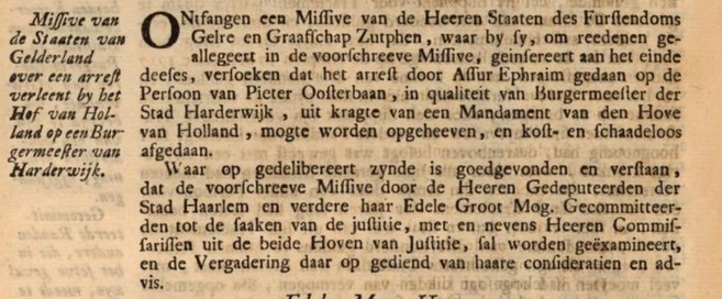 Het hof van Gelre stuurde daarop een dringend verzoek naar Den Haag om de burgemeester vrij te laten. Hoe de zaak verder afgelopen is, kon ik zo gauw niet vinden. Het lijkt mij waarschijnlijk dat het Amsterdamse deel van het prijzengeld bij Efraïm Asser is gebleven en het Harderwijkse deel bij de zaakwaarnemer van Emanuel van Gelder. Hoe dan ook, de wederzijdse weerzin tussen de Harderwijkse burgemeester en de Amsterdammer zal er niet minder om zijn geworden. Vandaar dat de volgende gebeurtenis, overgeleverd in een compleet ongerelateerd strafdossier uit 1737, me intrigeerde.